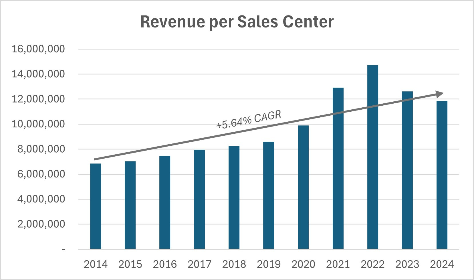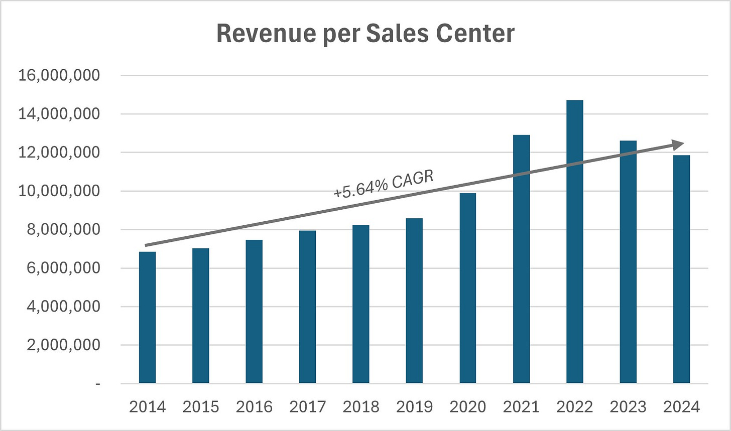 What sets Pool apart is not just the size of its network, but how well it performs. Since 2014, revenue per sales center has grown at nearly 6% CAGR, outpacing the more modest ~3% growth in center count. That implies improved utilization of each sales center.