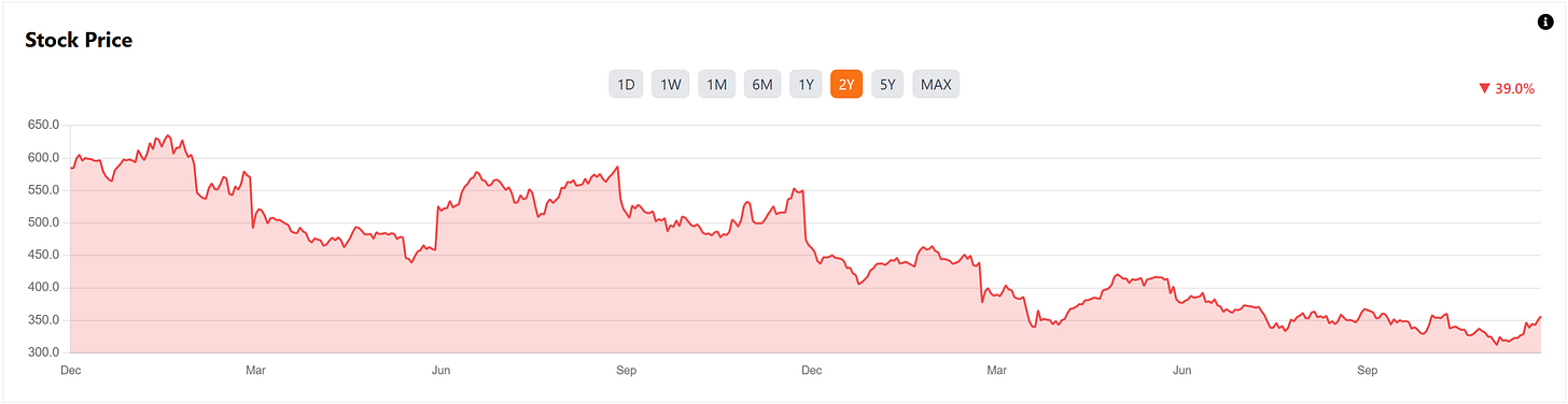 Essentially every financial metric is moving in the right direction. But the stock is not. Shares are still down 39% over the past two years.