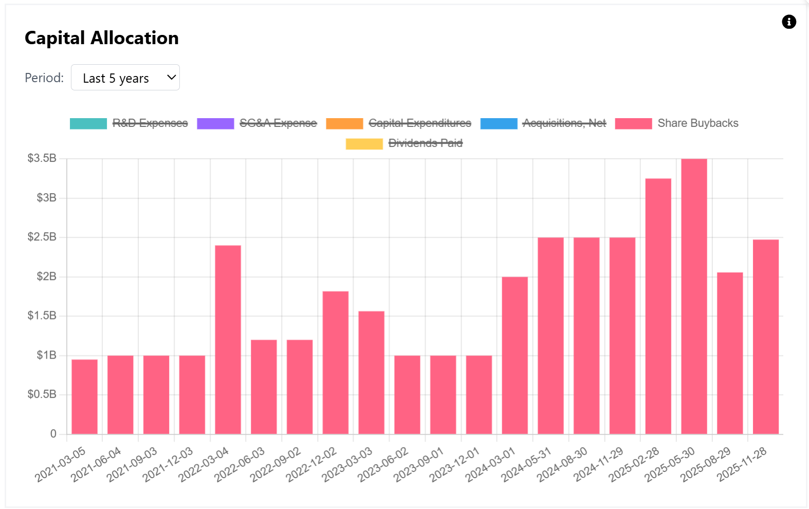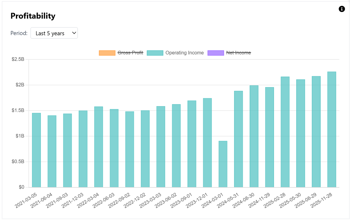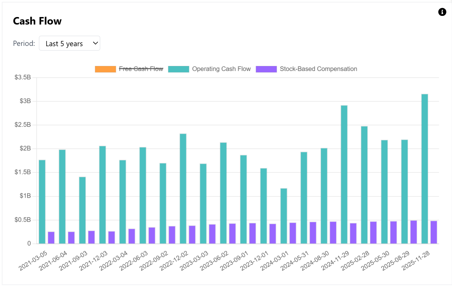 For the full year, operating income reached $8.7 billion, up an impressive 29% YoY, though following a flat 2024. Operating cash flow totaled $10 billion, implying an operating cash flow yield of 6.7%.