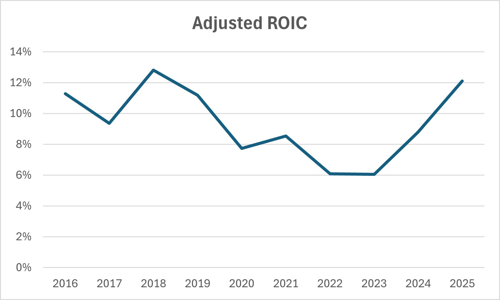 Since 2022, adjusted ROIC has been steadily rising, driven by stronger profitability, while invested capital has remained largely flat over the past four years.