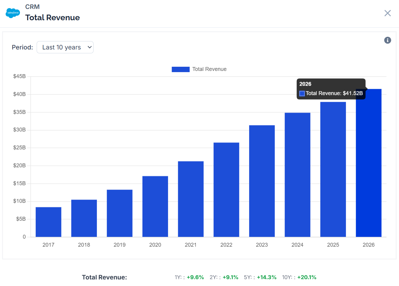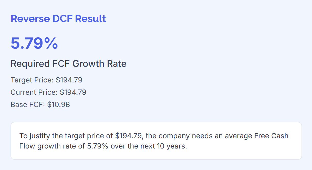 To justify today’s price, Salesforce would need to grow free cash flow at less than 6% annually, assuming a 10% discount rate and 2% terminal growth rate.