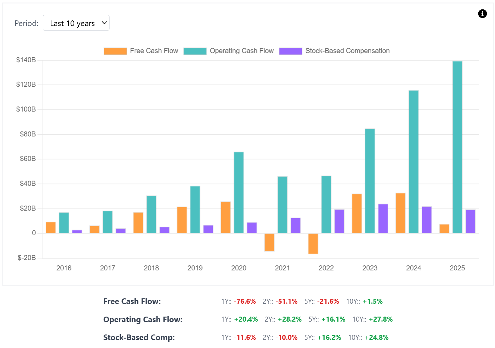 Despite strong results, 2025 free cash flow is now only $11.2 billion, dwarfed by the $132 billion in capex.